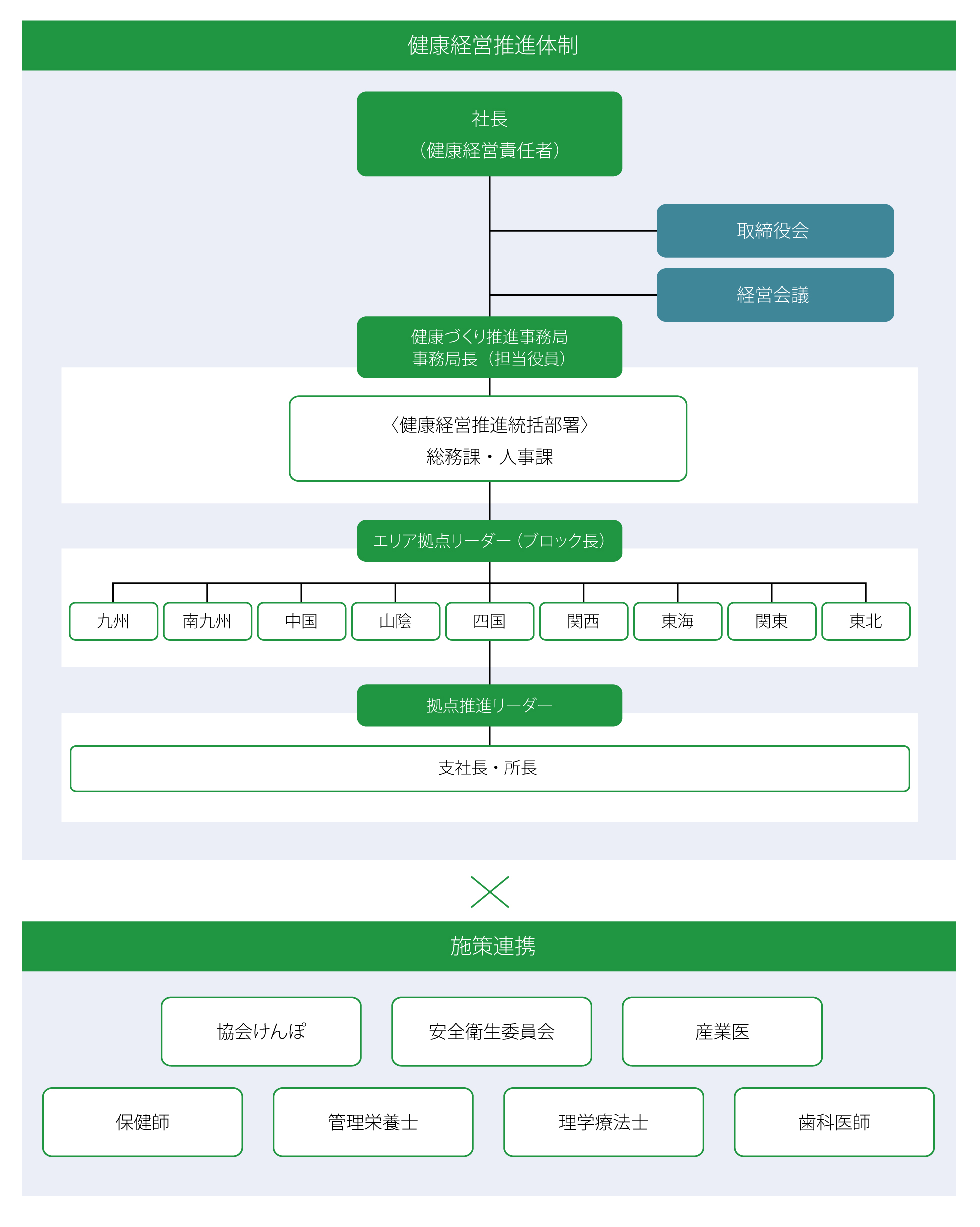 さらなる従業員及び家族の健康、労働環境の整備を進めるべく、健康に関する取り組み・活動・計画を見える化し、健康経営が当社の強みとして挙げられるよう推進して参ります。健康活動を通じて企業使命である「完璧な安全環境の構築、快適な労働環境の創造、自然との調和への美しい環境づくり」の実現を目指し、経営・従業員・家族がひとつになれる健康づくりを行ってまいります。