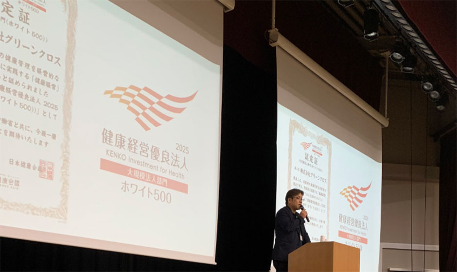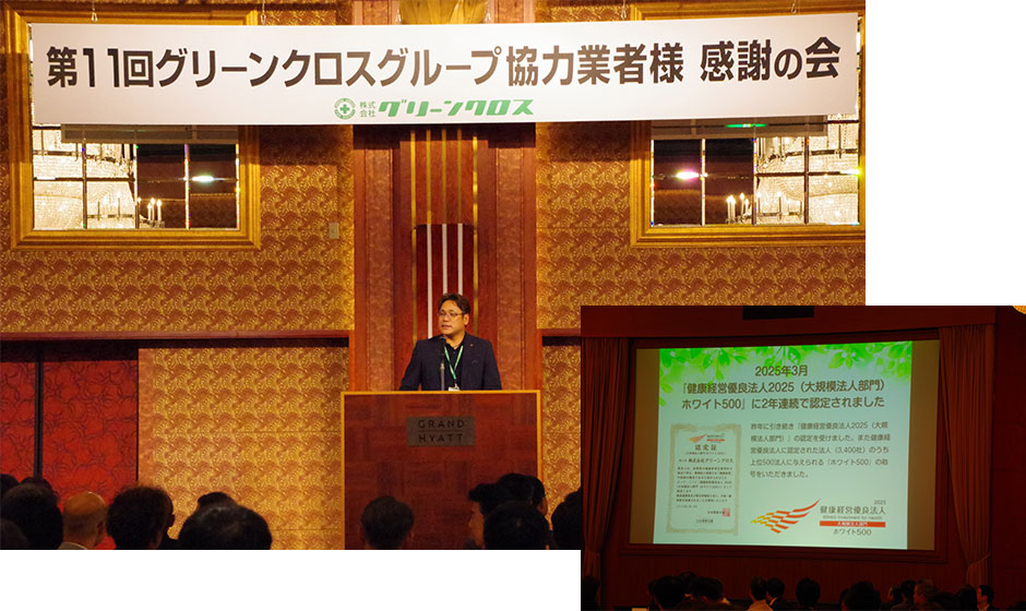 ・取引先業者様を招いた「第11回 グリーンクロスグループ 協力業者様感謝の会」において、弊社の健康経営の実践と社員のパフォーマンス向上の相乗効果に関して発表を行いました。(2025年8月)